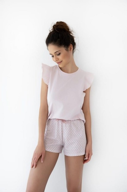 Górna część kompletu to jednolita koszulka z delikatnymi rękawami typu motylek, które dodają lekkości i subtelnej elegancji. Półokrągły dekolt podkreśla kobiecą linię szyi, zapewniając jednocześnie wygodę noszenia.
