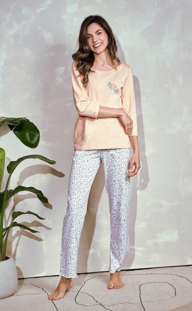 Bawełniana piżama damska Ariella od polskiego producenta Taro to połączenie komfortu i stylu, dostępna w dwóch pięknych wariantach kolorystycznych: brzoskwiniowym i błękitnym, z długimi spodniami w drobne kwiatki.