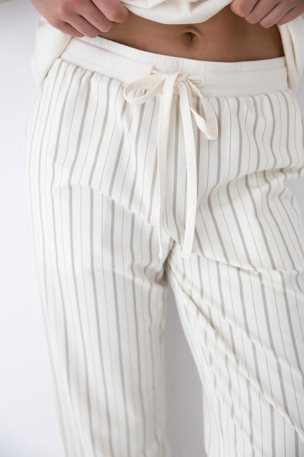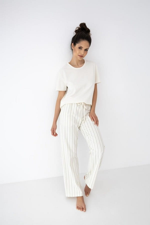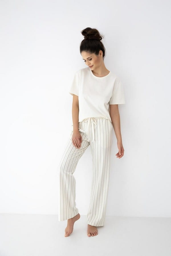 Koszulka z krótkim rękawem i półokrągłym dekoltem łączy wygodę z klasycznym krojem. Do kompletu dołączone są spodnie z delikatnym paskowym printem, a w pasie posiadają gumkę i troczek do wiązania kokardki, gwarantując idealne dopasowanie i swobodę ruchów.
