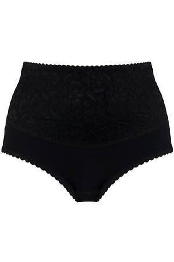 Bawełniane figi z wyższym stanem w czarnym kolorze, wykończone ozdobną, bezuciskową gumeczką. Figi z przodu mają wszytą podwójną warstwę materiału, dzięki czemu skutecznie spłaszczają brzuch, na przodzie posiadają ozdobną koronkę. Wysoka jakość tkanin wykorzystanych do szycia oraz staranność wykonania sprawia, że majteczki na długo zachowują swój kształt , nie odkształcają się po wielokrotnym praniu oraz nie strzępią. Polski producent Matex.
