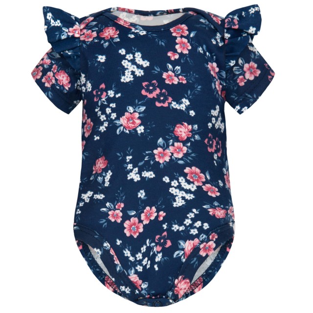 Wygodne i mięciutkie body z krótkim rękawem w słodkie różyczki na granatowym tle. Body niemowlęce posiada wszyte dwie zakładki przy szyjce, które wykończone są delikatną lamówką, dzięki czemu zakładanie ubranka jest wygodne i komfortowe dla mamy oraz bezpieczne dla niemowlaka. Body dla niemowląt stanowi niezbędny element w wyprawce dla noworodka.