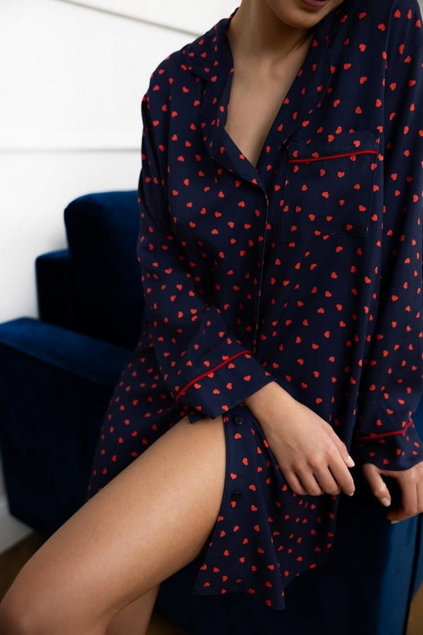 Koszula nocna damska Sophia to elegancka i wygodna opcja na spokojne noce. Wykonana z wysokiej jakości wiskozy w granatowym kolorze, ozdobiona subtelnym printem w czerwone serduszka, nadaje całości romantycznego charakteru. Długi rękaw i zapinana na guziki koszula z kołnierzykiem zapewnia komfort i klasyczny wygląd. Na piersi znajduje się naszyta kieszonka, dodając funkcjonalności i uroku.