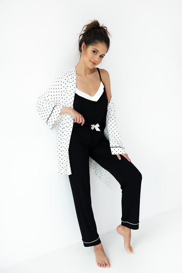 Koszulka na wąskich ramiączkach z kontrastowym dekoltem subtelnie podkreśla sylwetkę, a długie, proste spodnie z jasną lamówką dodają stylu. W pasie elastyczna gumka i satynowa kokardka, które gwarantują idealne dopasowanie.