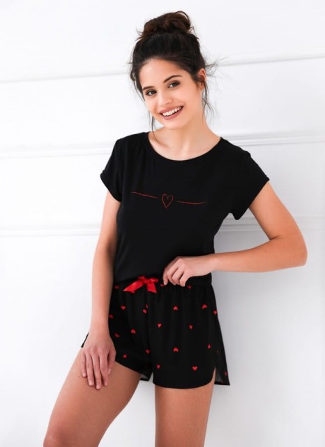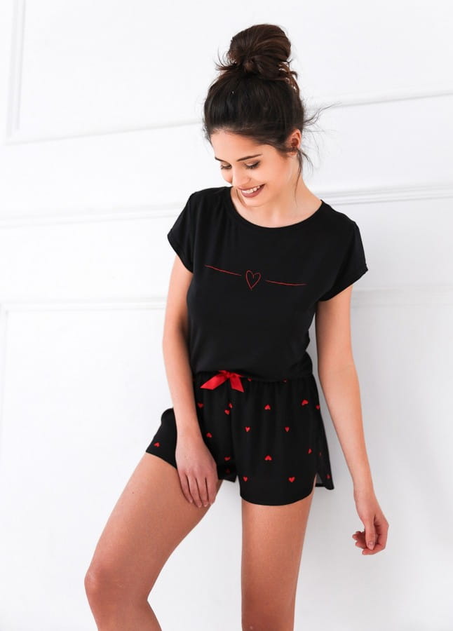 Krótkie spodenki piżamy utrzymane są w równie urokliwym stylu. Tkanina w serca nadaje im niepowtarzalny charakter, a dodatkowo zapewnia swobodę ruchów i przyjemne uczucie noszenia. Pas spodenek został ozdobiony elegancką satynową kokardką, nadając całości wyjątkowego, kobiecego charakteru.