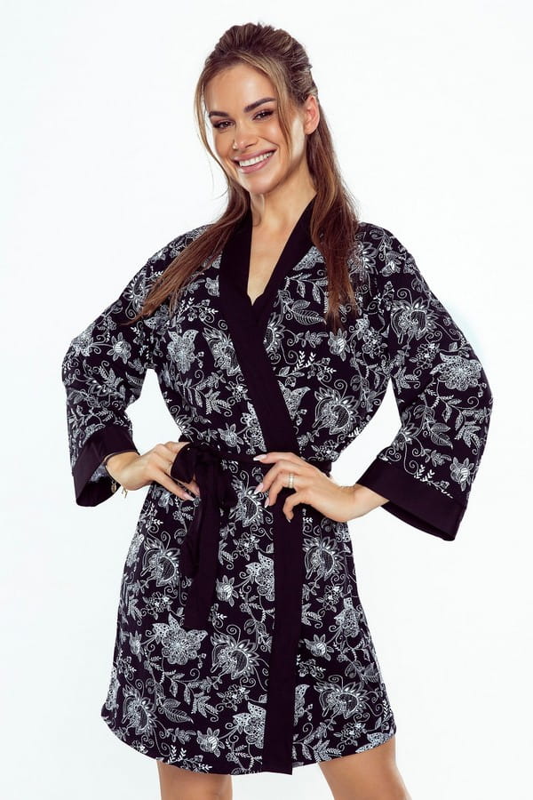 Dzianinowy szlafrok damski First Lady Shanti, czarny-kwiaty | Eldar