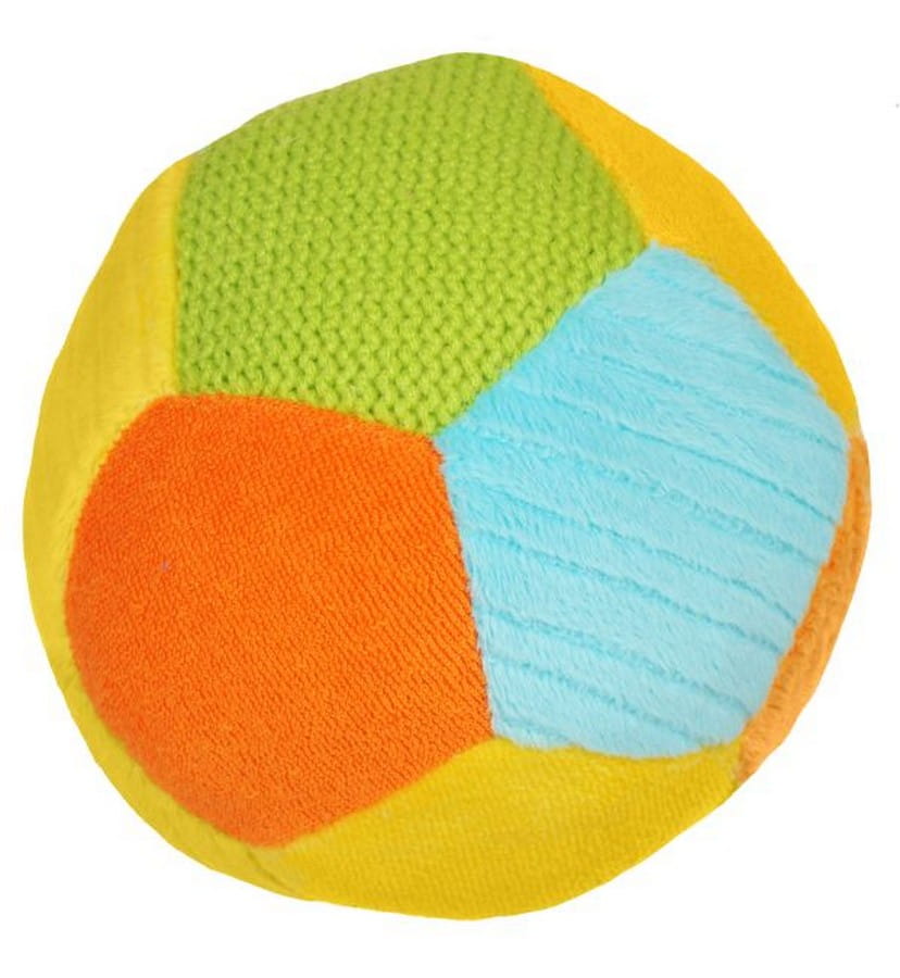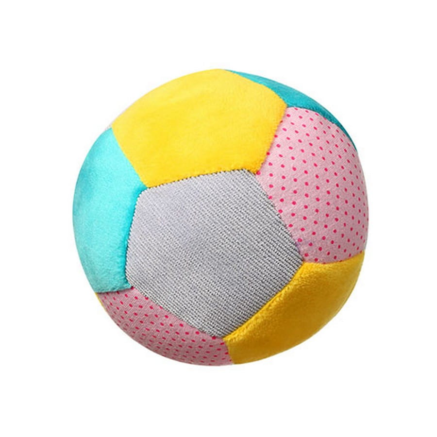 - Stymulujące kolory i wzory: Piłka wykonana jest z welurowego materiału i ozdobiona kontrastującymi kolorami ułożonymi w geometryczne pięciokąty, które nie tylko przyciągają wzrok, ale też uczą rozróżniania barw.