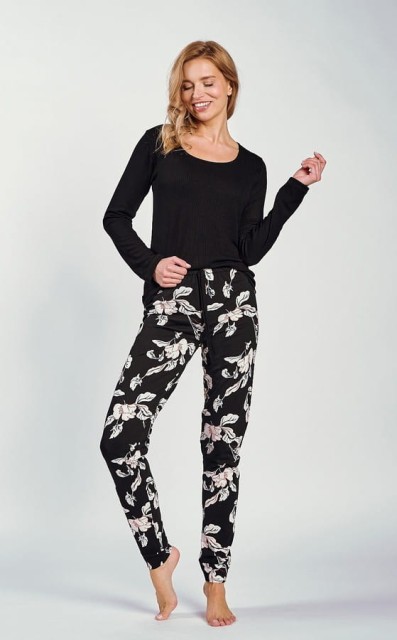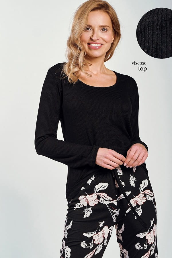 Piżama damska Charlotte od polskiego producenta Taro to wyjątkowy zestaw, który łączy w sobie styl, wygodę oraz wysoką jakość wykonania. Górna część piżamy to koszulka z długim rękawem, wykonana z przyjemnej w dotyku, prążkowanej wiskozy z dodatkiem elastanu, co gwarantuje doskonałe dopasowanie do ciała i komfort noszenia. Klasyczny, czarny kolor oraz subtelny półokrągły dekolt dodają elegancji, sprawiając, że piżama jest nie tylko wygodna, ale również stylowa.