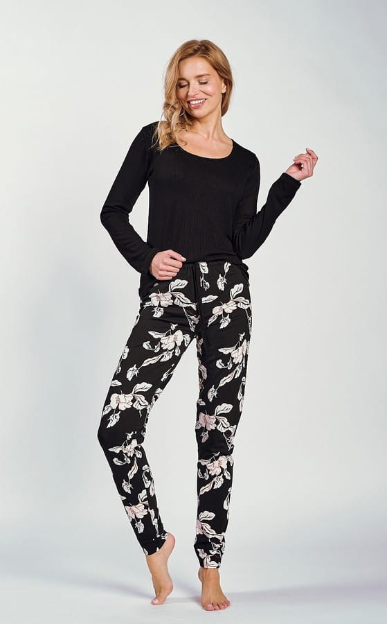 Spodnie są długie, uszyte w całości z miękkiej i przewiewnej bawełny. Czarne tło materiału ozdobione jest subtelnym kwiatowym printem, co nadaje im wyjątkowego charakteru. W pasie znajduje się gumka obszyta dzianiną, dzięki której spodnie idealnie przylegają do ciała, nie uciskając i zapewniając pełną swobodę ruchów.