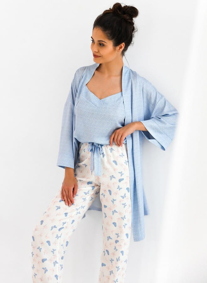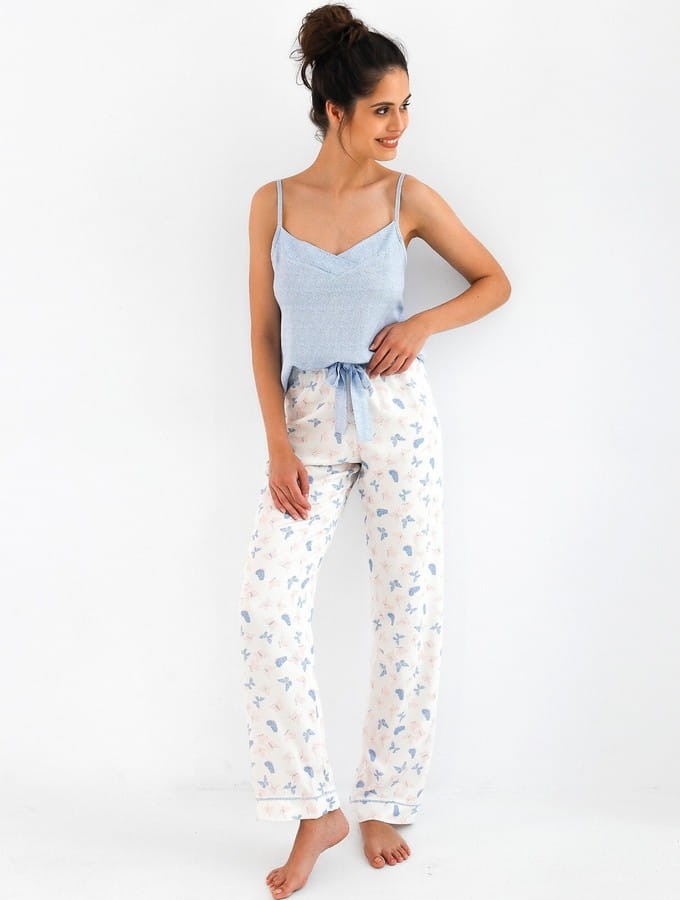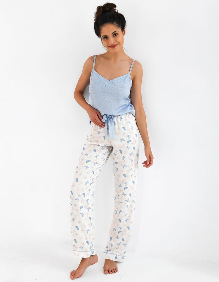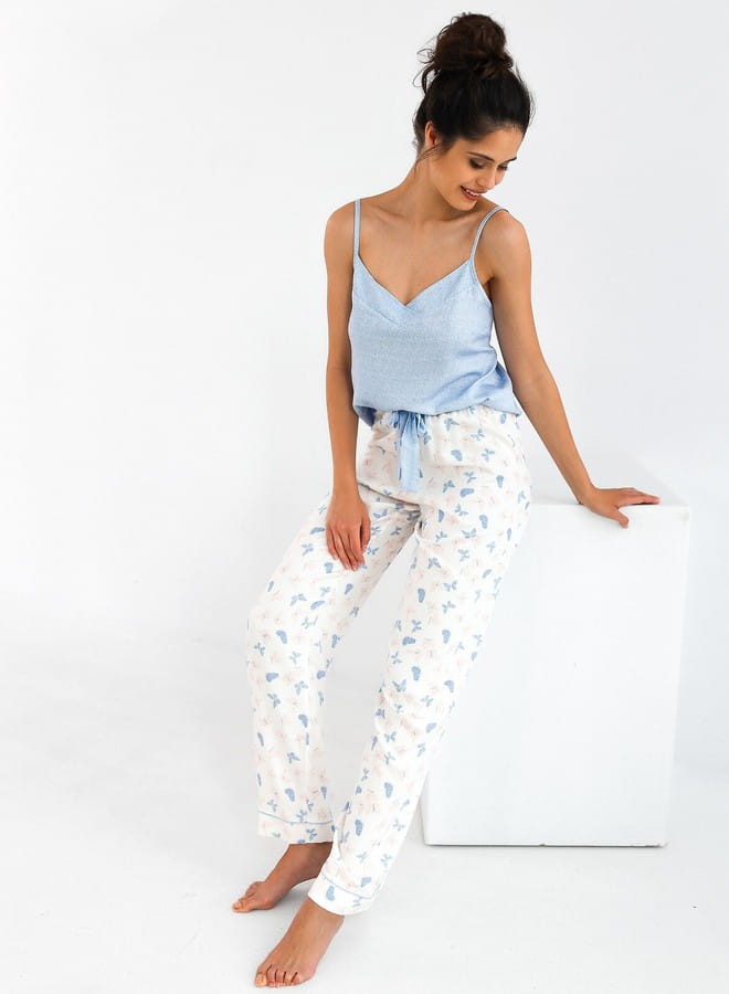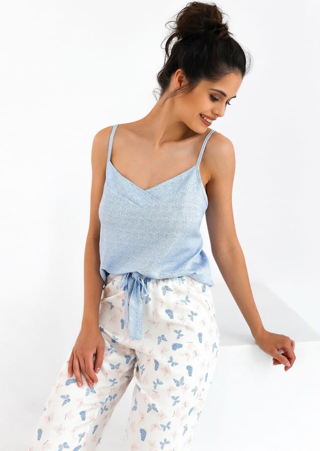 Zestaw składa się z koszulki na wąskim ramiączku oraz długich, prostych spodni z uroczym printem w motylki. Spodnie mają gumkę w pasie i ozdobną wiązaną taśmę, co zapewnia wygodne dopasowanie i elegancki wygląd.