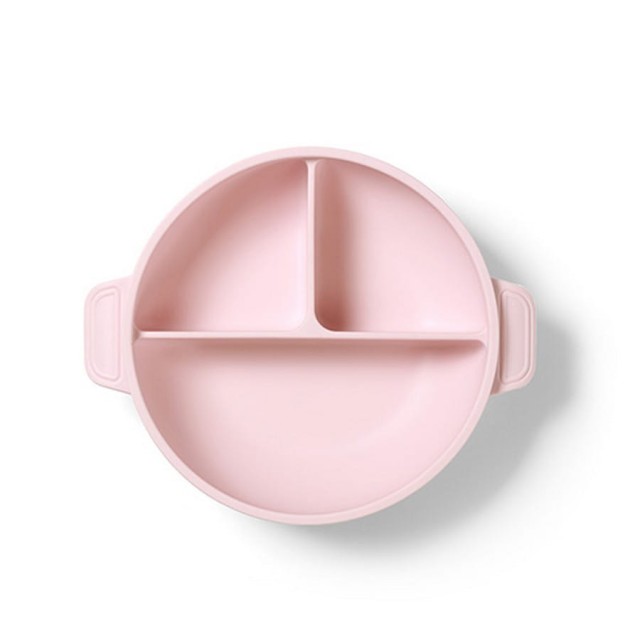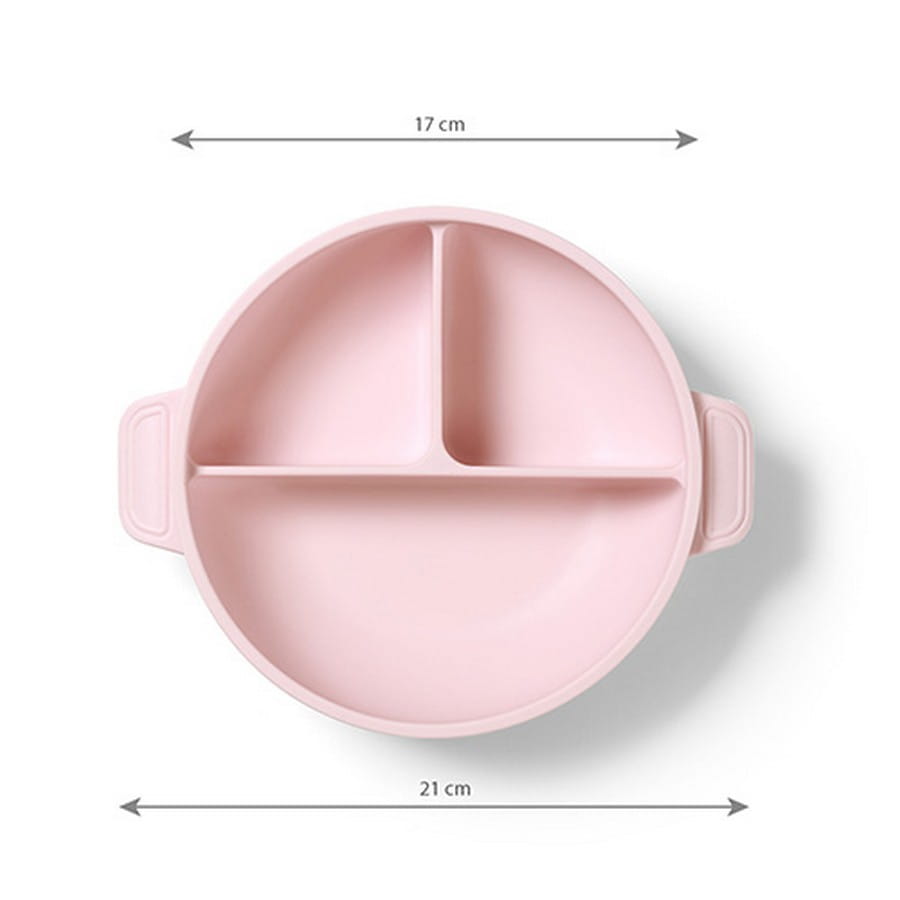 Mocna przyssawka trzyma silikonowy talerz na swoim miejscu, a zaokrąglony kształt ułatwia nabieranie pokarmu. Trzy przegródki pozwalają rozdzielić składniki, by dziecko mogło próbować każdego smakołyku osobno.