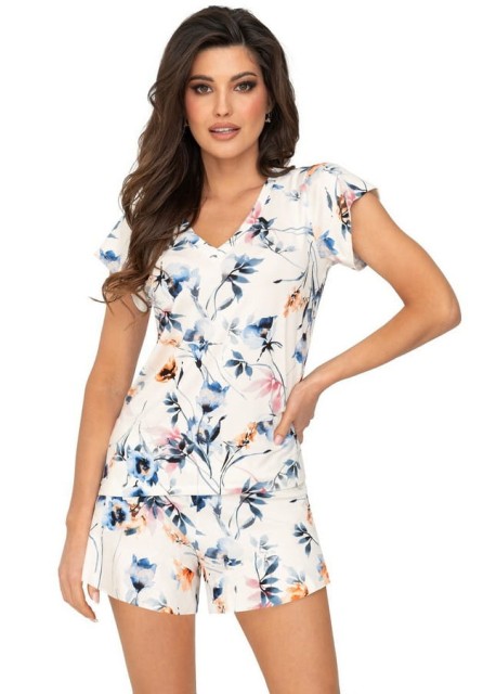 Góra piżamy posiada krótki rękaw oraz dekolt w kształcie litery "V", co dodaje całości subtelnej elegancji i kobiecego wdzięku. Spodenki o klasycznym kroju z krótką nogawką zapewniają swobodę ruchów i komfort podczas snu.