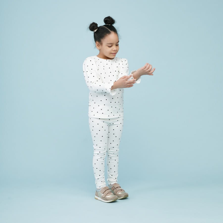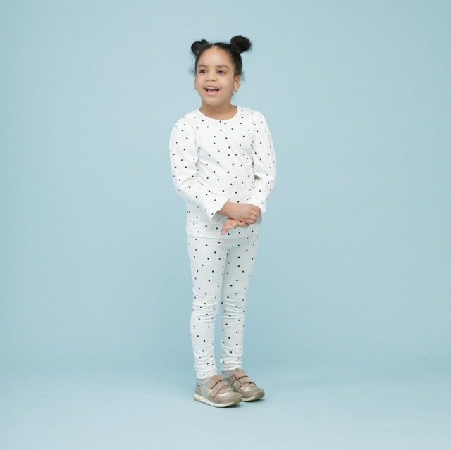 - Uroczy nadruk w groszki wykonany bezpiecznymi farbami na bazie wody.