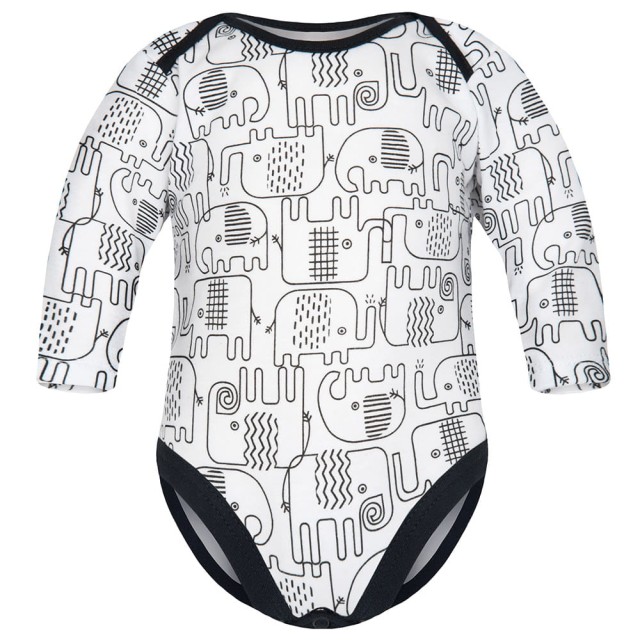 Czarno - białe body dla dziecka z długim rękawem. Wzór w czarne słonie na białym tle idealnie pasuje dla chłopca. Bodziak może być noszony jako samodzielne ubranko w letnie dni oraz jako bielizna pod cieplejsze ubranka w zimie. Dzięki napom w kroku wymiana pieluszki jest szybka i łatwa nawet podczas snu dziecka. Body świetnie prezentuje się z półśpiochami w kolorze czarnym lub białym oraz ubrankami z kolekcji "Czarne Słonie" od Dolce Sonno,