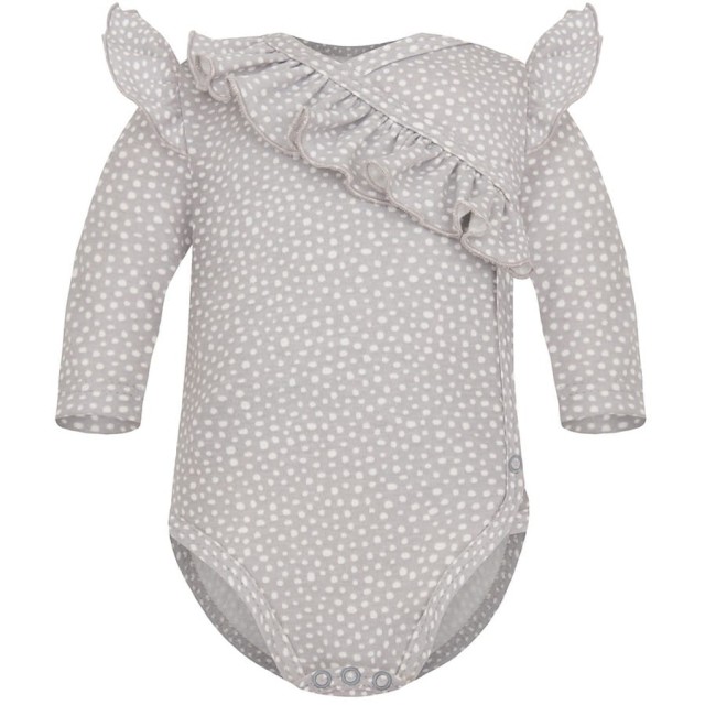 Body dla dziewczynki uszyte z certyfikowanej bawełny, bezpiecznej dla wrażliwej skóry dziecka. Specjalna konstrukcja body z rozpięciem po całej długości oraz w kroku pozwala na wygodne przebieranie Maluszka oraz szybką wymianę pieluszki. Ubranko zdobią urocze falbanki i print w białe kropeczki na szarym tle.