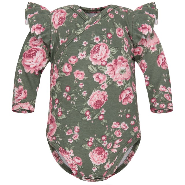 Body z długim rękawem w kwiaty na zielonym tle. Bodziak posiada urocze falbanki na ramionkach. Rozpinane po boku, po całej długości, ułatwia przebieranie Maluszka. Body kopertowe występuje w rozmiarach 56,62,68. Świetnie sprawdzi się jako samodzielne ubranko lub stworzy śliczny komplet z innymi częściami garderoby o tym samym wzorze.