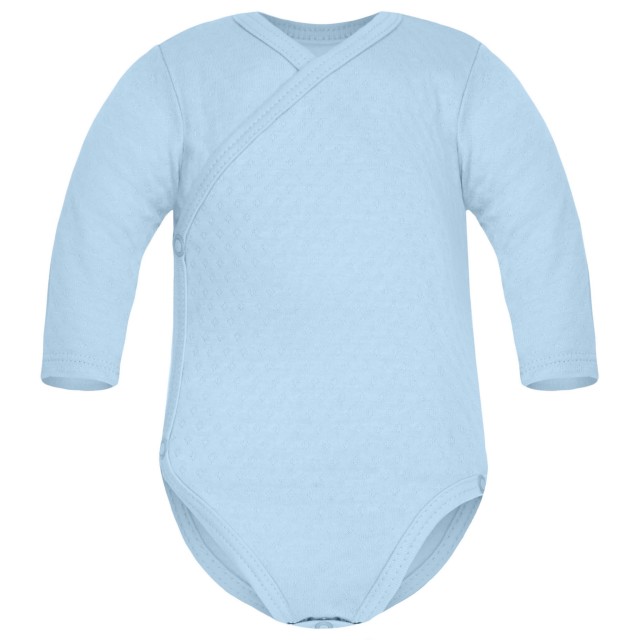Body z długim rękawem ażurowe w kolorze pastelowego błękitu, idealne dla chłopca. Uszyte z wyjątkowo miękkiej i przewiewnej bawełny Soft. Bodziak stanowi niezbędny element pierwszej garderoby naszego maluszka. Specjalny krój oraz rozpinanie po całej długości sprawia, że ubieranie niemowlaka oraz wymiana pieluszki jest komfortowa nawet w trakcie snu maluszka. Body kopertowe dostępne jest w rozmiarach 56 oraz 62.