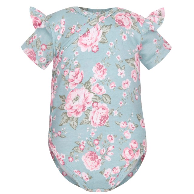 Body z krótkim rękawem w urocze różowe kwiaty na seledynowym tle. Body posiada ozdobne falbanki na ramionach z tej samej bawełny. Rozpinanie po całej długości oraz w kroku ułatwia przebieranie Maluszka oraz wymianę pieluszki. Body kopertowe występuje w rozmiarach 56,62,68. Świetnie sprawdzi się jako samodzielne ubranko lub stworzy śliczny komplet z innymi częściami garderoby o tym samym wzorze.
