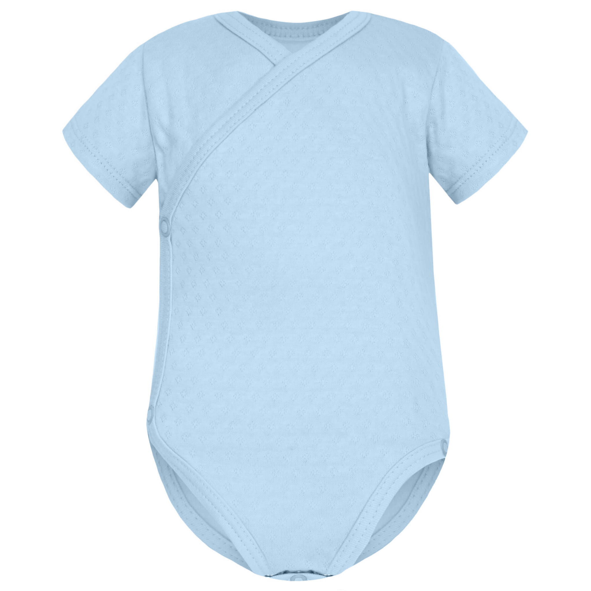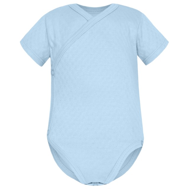 Body krótki rękaw z milutkiej w dotyku bawełny ażurowej Soft w kolorze pastelowego błękitu. Body rozpinane jest na bezpieczne, bezniklowe napy po całej długości, wykończone delikatną lamówką. Body kopertowe stanowi niezbędny element w wyprawce dla noworodka. Występuje w rozmiarze 56 oraz 62.