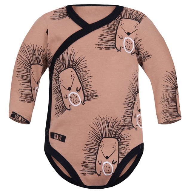Mięciutkie i wygodne body z długim rękawem w urocze jeże na brązowym tle. Body kopertowe rozpinane jest po boku, po całej długości na bezpieczne napy umożliwiające bezpieczne przebranie maluszka. Całość wykończona bawełnianą, czarną lamówką. Body dla niemowląt stanowi niezbędny element w wyprawce dla noworodka i niemowlaka, występuje w rozmiarach 56,62,68. Bodziak świetnie sprawdza się jako samodzielne ubranko w ciepłe, letnie dni jak również w zestawie z innymi z kolekcji "Brązowe Jeże".