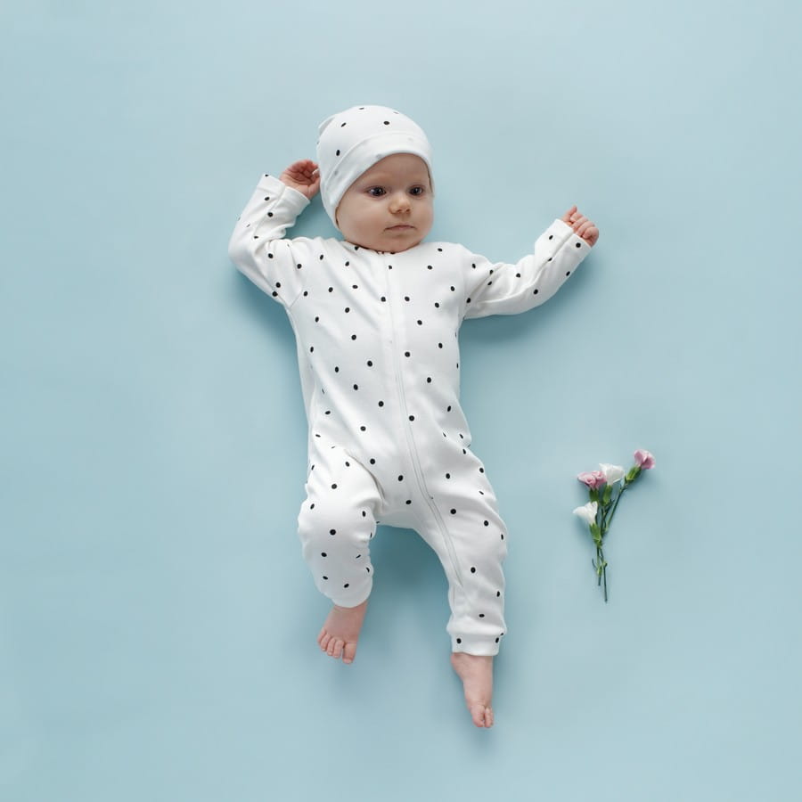Czapka z cienkiej i elastycznej dzianiny bawełnianej w groszki z kolekcji "Tres Bien". Czapka sprawdzi się w domu po kąpieli oraz podczas spacerów latem. Zapewnia dobrą cyrkulacje powietrza, zapobiegając przegrzaniu się głowy dziecka. Idealna do wyprawki dla noworodka.
