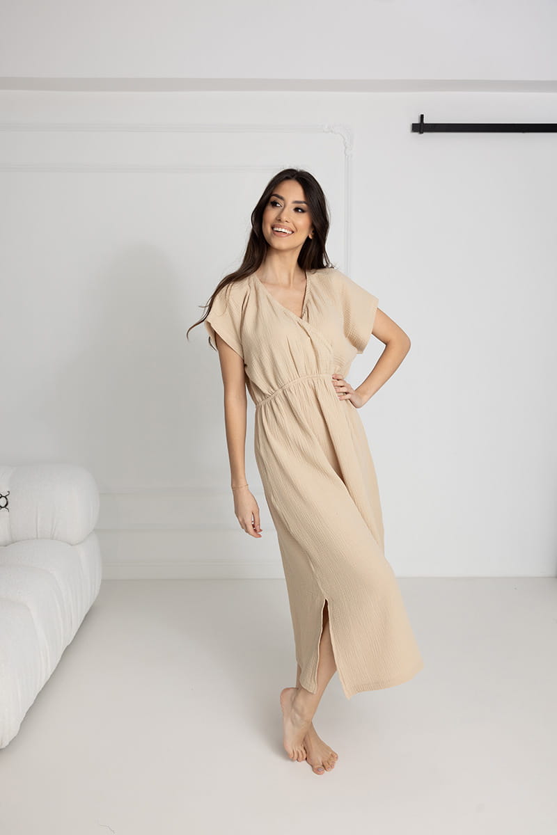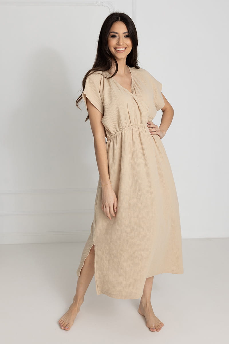 Wykonana z miękkiego, oddychającego muślinu bawełnianego, gwarantuje komfort przez cały rok. Długi fason z rozporkami po bokach i delikatnym marszczeniem pod biustem świetnie dopasowuje się do ciała, zarówno w ciąży, jak i po porodzie, zapewniając Ci pełną swobodę ruchów.