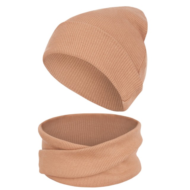 Jesienno-zimowy komplet niemowlęcy, składający się z klasycznej, wywiniętej na zewnątrz czapki oraz ozdobnie skręconego komina. Minimalistyczny, ponadczasowy krój doskonale komponuje się z każdą stylizacją.