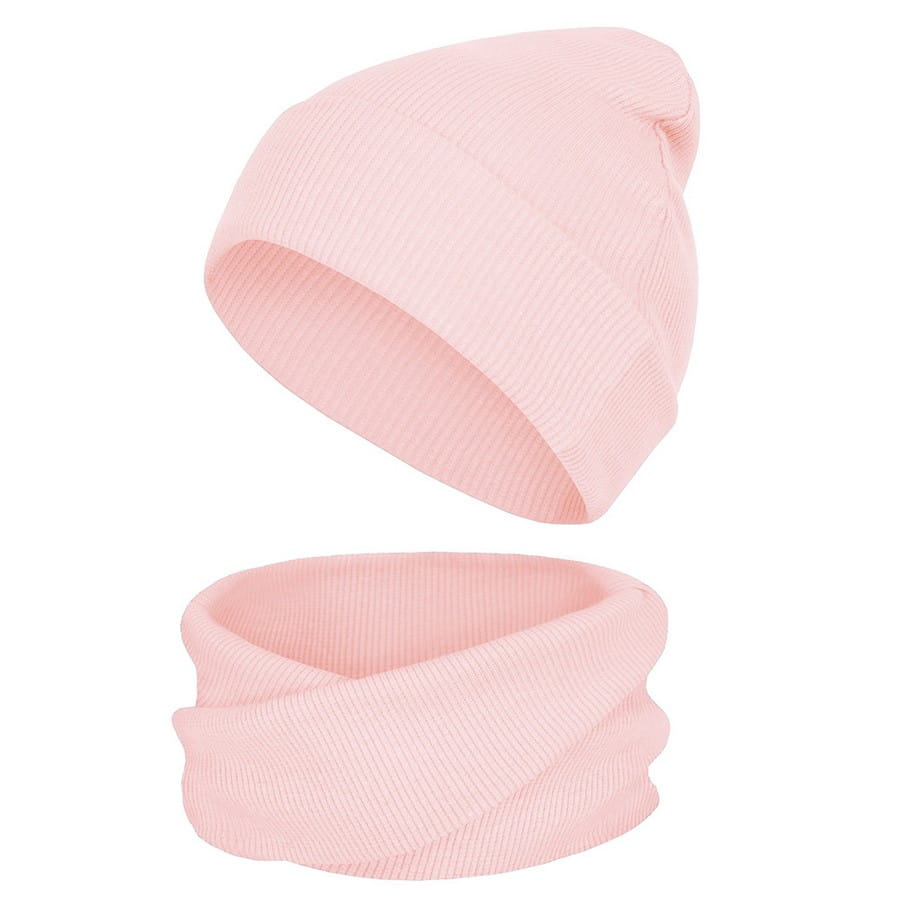 Miękki i delikatny dla skóry zestaw dla niemowlaka oraz starszego dziecka składający się z modnie wywiniętej czapeczki oraz skręconego komina. Zestaw w jasnoróżowym kolorze dla dziewczynki.