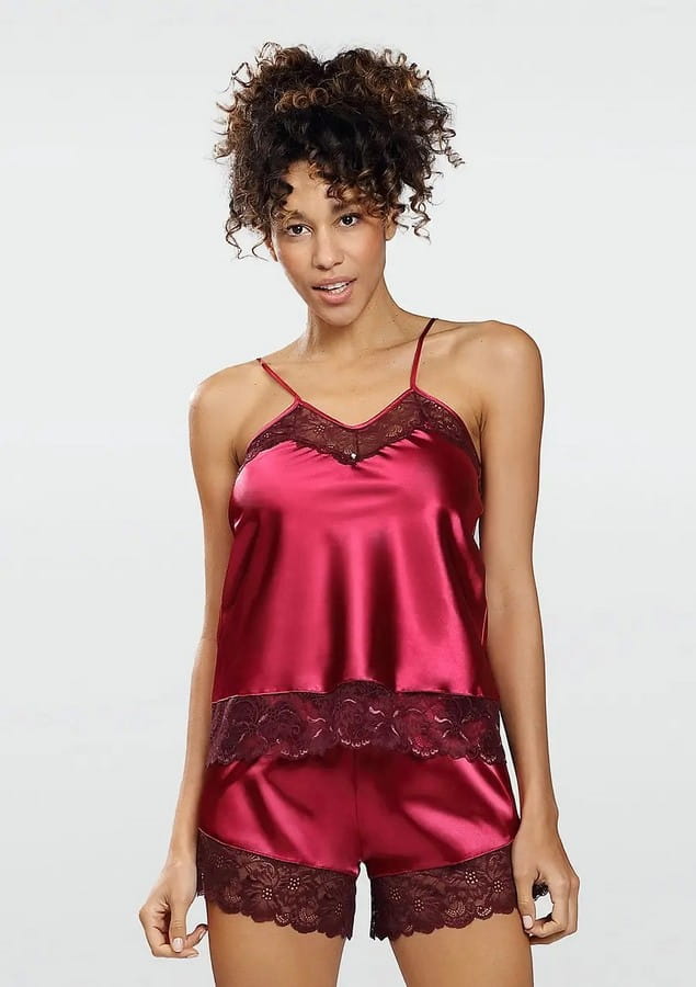 Komplet nocny "Brenda" uszyty z milutkiej w dotyku jedwabistej satyny w bordowym kolorze. W skład zestawu wchodzi koszulka na cienkich, regulowanych ramiączkach z dekoltem w szpic, obszyta efektowną koronką w motyw kwiatowy. Całość dopełniają krótkie, luźne szorty z gumką w pasie, nogawki zakończone również koronką. Całość lekka i zwiewna, bardzo wygodna, idealna na lato. Piżamka opakowana w eleganckie pudełko, może być doskonałym prezentem dla najbliższej osoby.