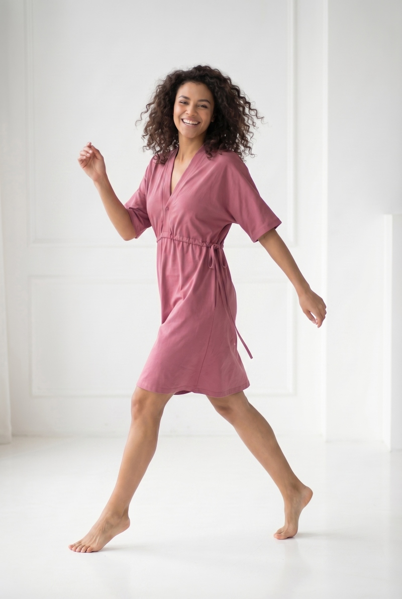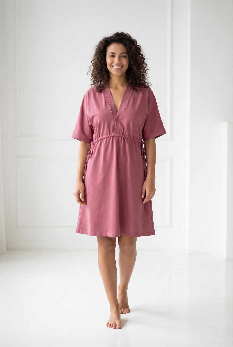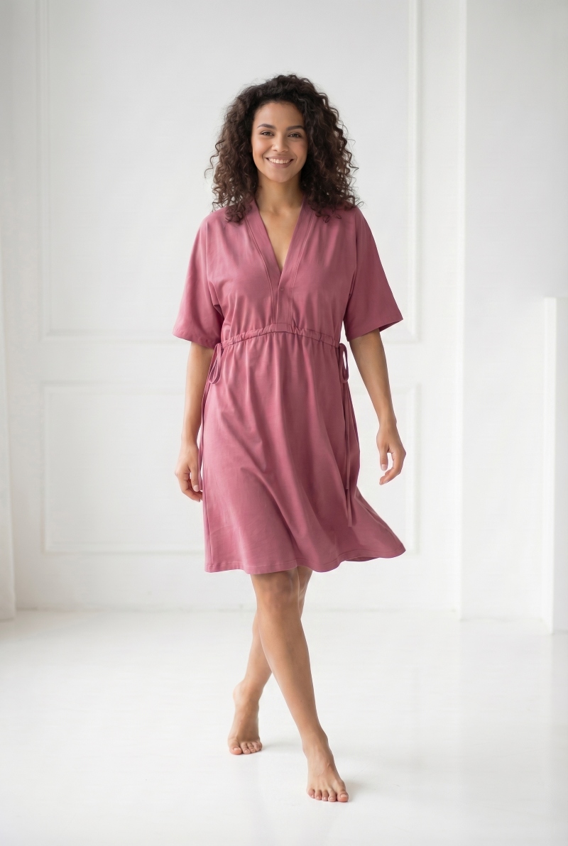 Koszula posiada krótki rękaw kimono, który zapewnia swobodę ruchów i delikatnie podkreśla ramiona. Dekolt w kształcie litery V z jedną napą umożliwia wygodne karmienie piersią, jednocześnie zachowując dyskretny i estetyczny wygląd.