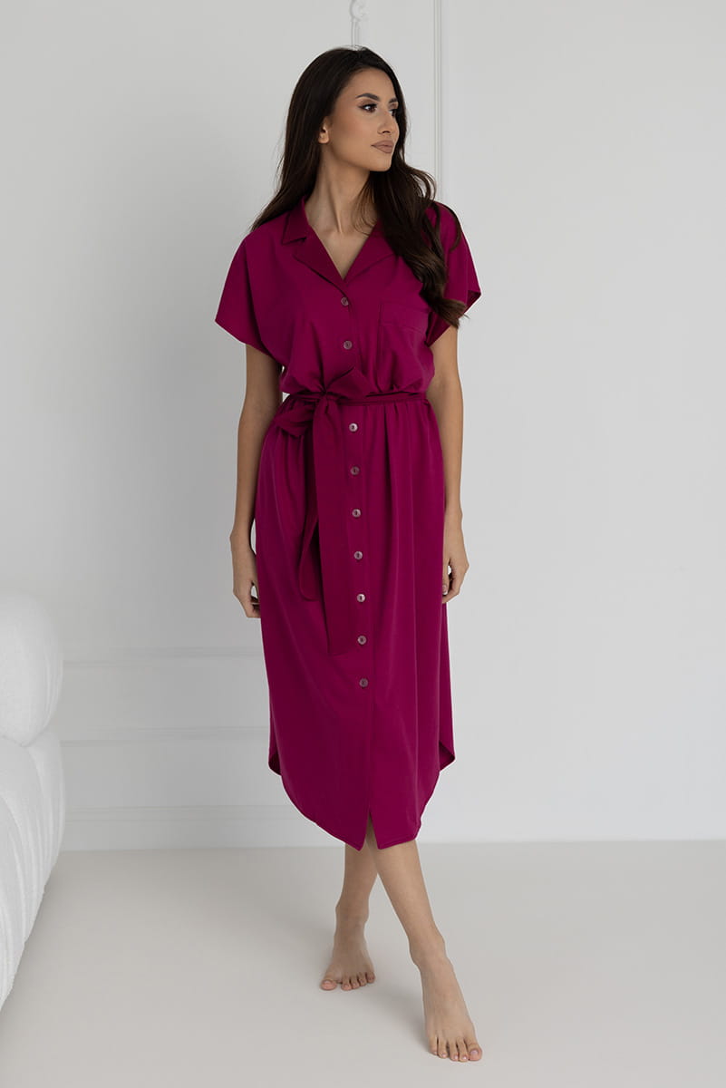 Jej długość 7/8 subtelnie podkreśla kobiecy charakter, dodając całości elegancji. Krótki rękaw o kroju lekkiego kimona zapewnia swobodę ruchów i delikatnie otula ramiona, wprowadzając element lekkości. Stylowy kołnierzyk dodaje klasy, czyniąc koszulę zarówno wygodną odzieżą nocną, jak i eleganckim homewear'em.