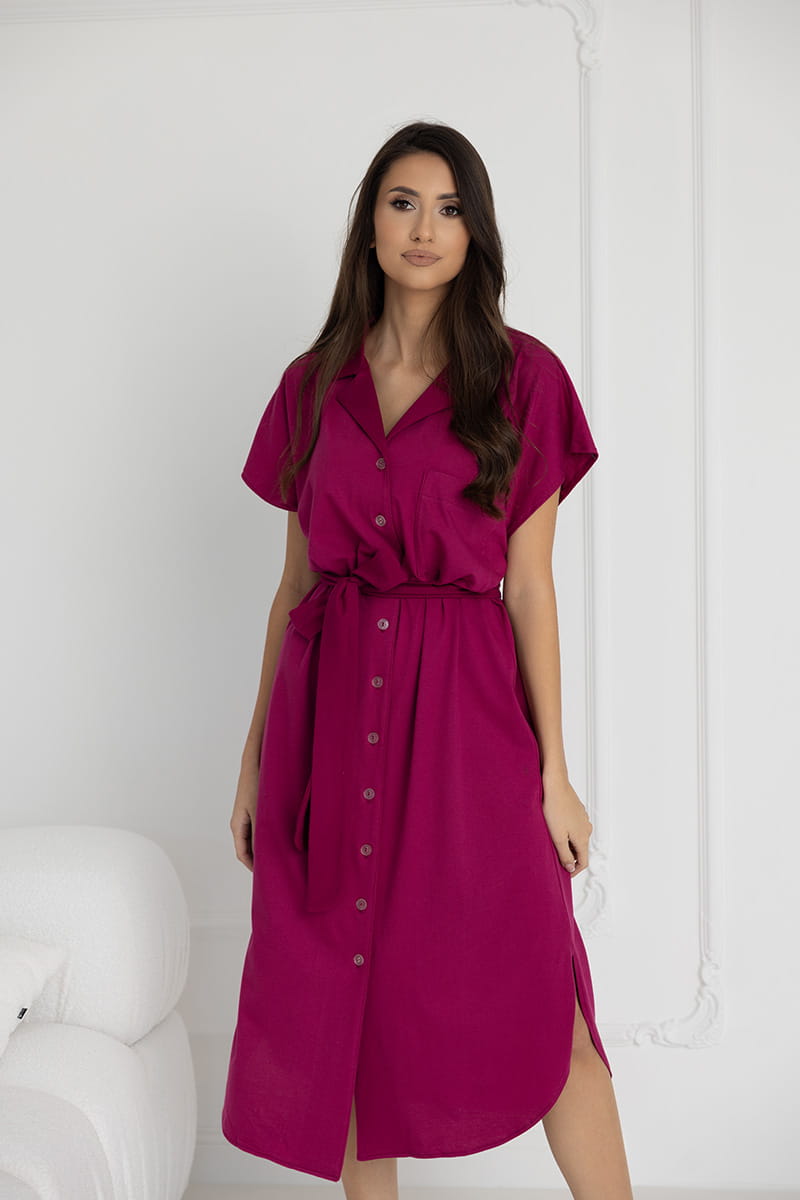 Koszula posiada eleganckie rozcięcia po bokach i zaokrąglony dół, który pięknie układa się na sylwetce, nie krępując ruchów podczas chodzenia i spania. Dodatkowym elementem jest pasek z tej samej tkaniny, który można przewiązać w efektowną kokardę, nadając koszuli wyjątkowego uroku. Pasek można zawiązać nad ciążowym brzuszkiem lub w talii, podkreślając kobiecie kształty i dodając całości elegancji.