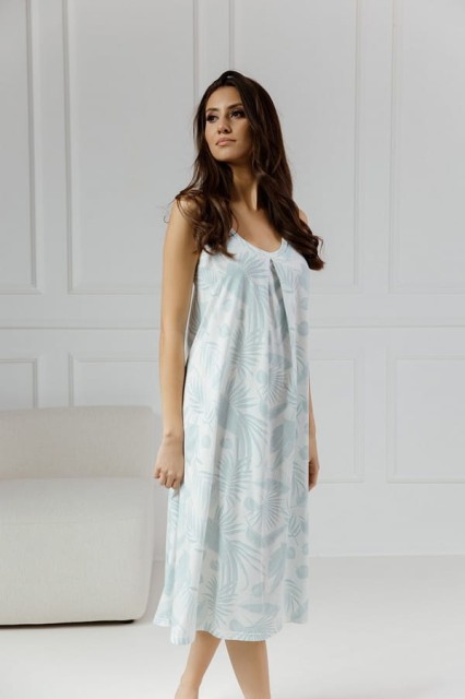Koszula nocna "Sofia" to kwintesencja wygody i kobiecości. Wykonana z delikatnej, 100% tkaniny bawełnianej, ozdobiona egzotycznym motywem liści w kolorze iceberg, daje połączenie świeżości i subtelnego uroku.