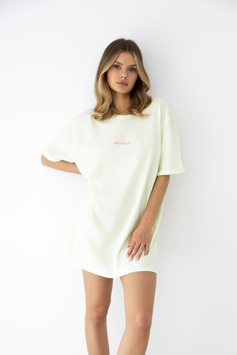 Uniwersalny rozmiar sprawia, że koszula dopasowuje się do różnych sylwetek, a subtelny, ozdobny napis z przodu dodaje modowego akcentu, który wyróżnia ją w domowej garderobie. To idealny wybór dla kobiet, które chcą połączyć styl z codziennym komfortem – zarówno na wieczorny relaks, jak i spokojne poranki.