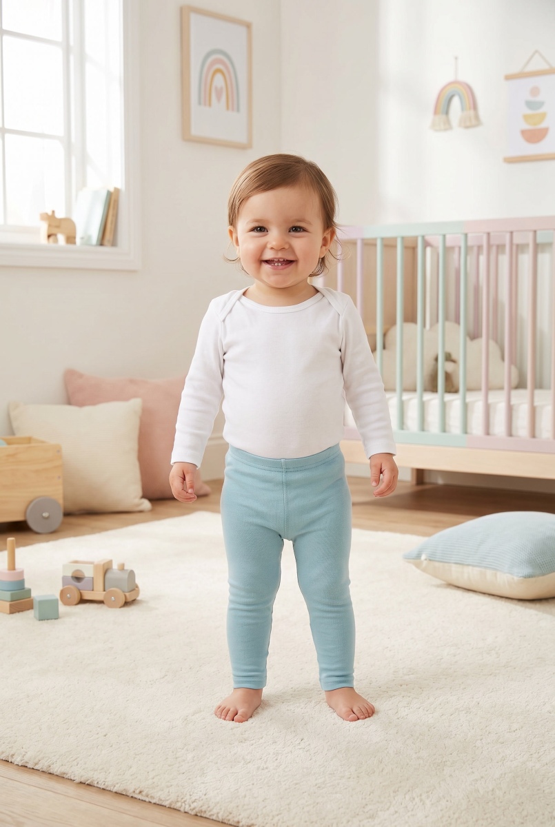Legginsy niemowlęce to uroczy i wygodny wybór dla najmłodszych członków rodziny. Wykonane z miękkiej, wyjątkowo elastycznej dzianiny w drobny prążek w odcieniu "Iceberg", legginsy są nie tylko urocze, ale również praktyczne.