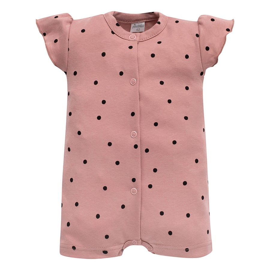 Oto idealne rozwiązanie dla Maluszków na lato - krótki rampers Pinokio w groszki! Zapinany na napy, lekki, wykonany z przewiewnej bawełny w kolorze blush.