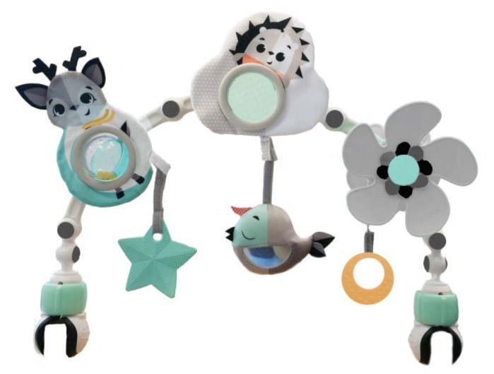 - Uniwersalne klipsy mocujące pasują do większości wózków, a elastyczny łuk wygina się do przodu i do tyłu oraz w górę i w dół, dostosowując się do wieku dziecka i preferencji zabawy.