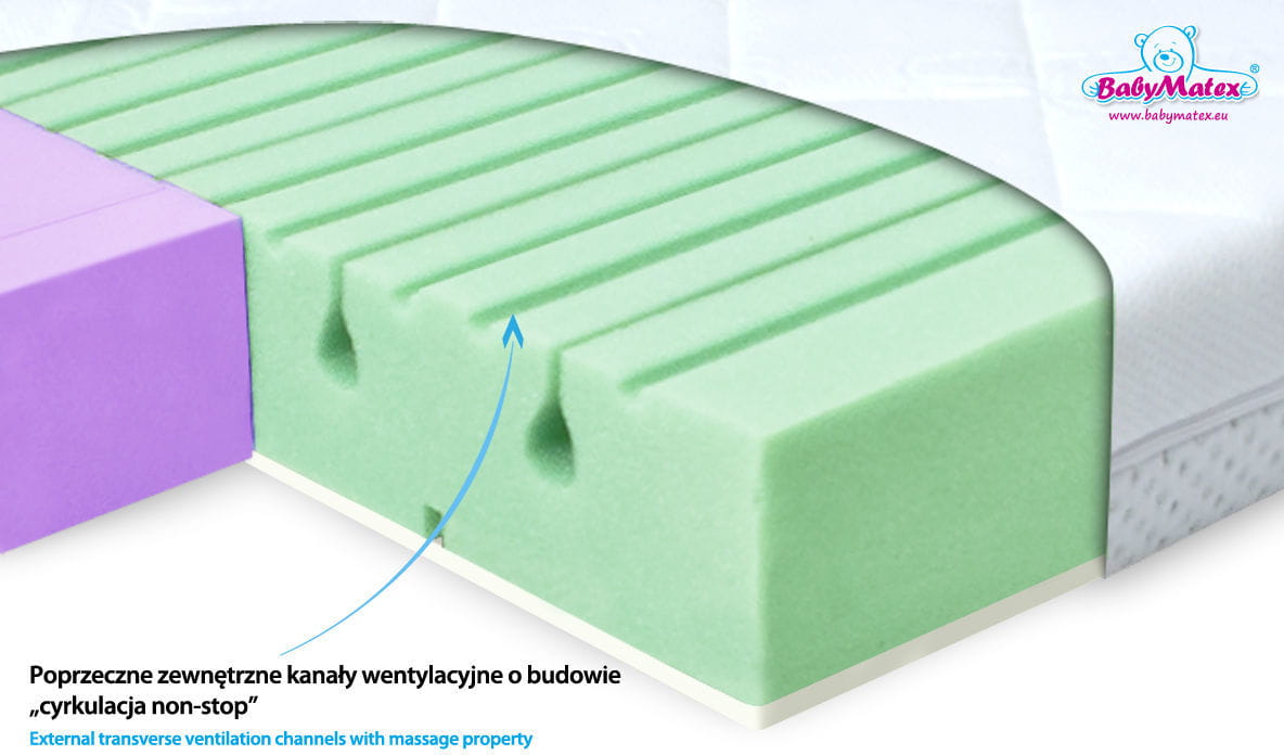 Kolejną warstwę stanowi profilowana pianka z funkcją wentylacji i masażu z poprzecznymi kanałami zapewniającymi doskonałą cyrkulację powietrza. Dodatkowo dzięki belkom stabilizującym na bokach materacyka, dziecko leży wygodnie na całej powierzchni materaca.