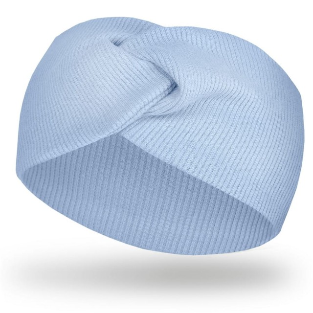 Błekitna opaska na głowę dla dziewczynki z ozdobnym splotem na przodzie. Uszyta z miękkiej dzianiny elastycznej w prążek, w pięknym pastelowym kolorze. Opaska jest przyjemna w dotyku i elastyczna, dzięki czemu nie uciska i nie podraznia główki Maluszka. Minimalistyczny krój oraz jednolity kolor sprawiają, że jest ona modnym elementem codziennej stylizacji. Opaska jest szeroka więc z powodzeniem zastąpi czapki i inne okrycia głowy w okresie jesienno - wiosennym oraz w letnie wietrzne dni, chroniąc wrażliwe uszy niemowlaka przed wiatrem i chłodem.