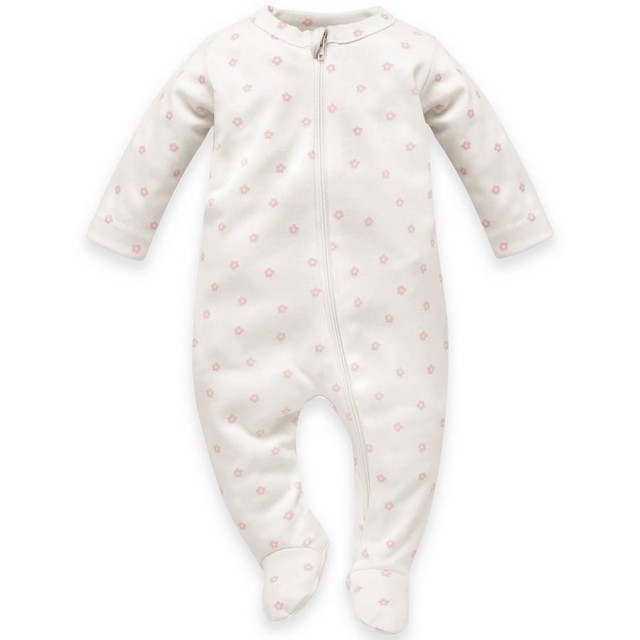 Pajac niemowlęcy zapinany na suwak z kolekcji "Lovely Day", wykonany w 100% z certyfikowanej bawełny w kolorze ecru z printem w różowe kwiatki. To ubranko dla niemowląt, to doskonały wybór dla rodziców ceniących wygodę i klasyczne rozwiązania w garderobie swojego Maluszka.