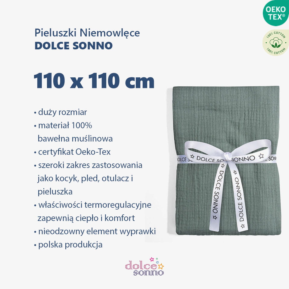 Szukasz wyjątkowo miękkiej i bezpiecznej pieluszki dla swojego dziecka? Duża pieluszka muślinowa Dolce Sonno 110x110 cm to idealny wybór. Uszyta w Polsce z certyfikowanej bawełny Double Gauze, zgodnej ze standardem Oeko-Tex Standard 100, zapewnia nie tylko najwyższy komfort, ale również bezpieczeństwo dla delikatnej skóry dziecka.