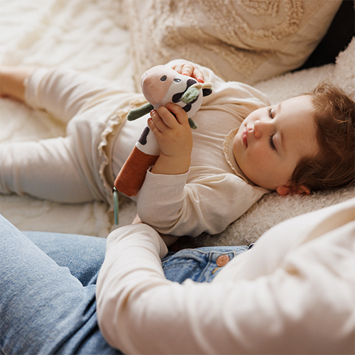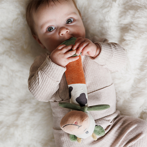 Podłużna, miękka forma – ułatwia trzymanie i manipulowanie zabawką, co ma znaczenie w rozwijaniu pierwszych umiejętności manualnych.