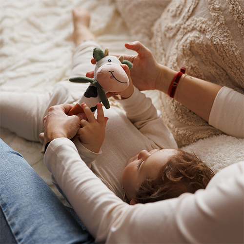 Piszczek Cow Bingo – miękka zabawka sensoryczna z gryzakiem