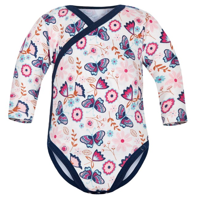 Body z długim rękawem w kolorowe motylki i kwiatuszki na białym tle z granatową lamówką, idealne dla dziewczynki. Bodziak rozpinany jest na bezniklowe napy po całej długości oraz w kroku, umożliwia to szybką wymianę pieluszki nawet w nocy podczas snu niemowlaka. Body kopertowe występuje w rozmiarach 56,62,68. Ubranko może być noszone samodzielnie lub tworzyć zestaw z innymi częściami garderoby np. z półśpiochami.