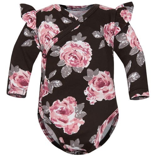 Śliczne body z długim rękawem z ozdobną falbanką, w duże róże na brązowym tle. Bodziak z najnowszej kolekcji "Retro Style" od Dolce Sonno. Specjalny krój body kopertowego sprawia, że przebieranie maluszka staje się niezwykle wygodne i bezpieczne dla niemowlaka. Body kopertowe stanowi niezbędny element w wyprawce dla noworodka i niemowlaka, występuje w rozmiarach 56,62,68.