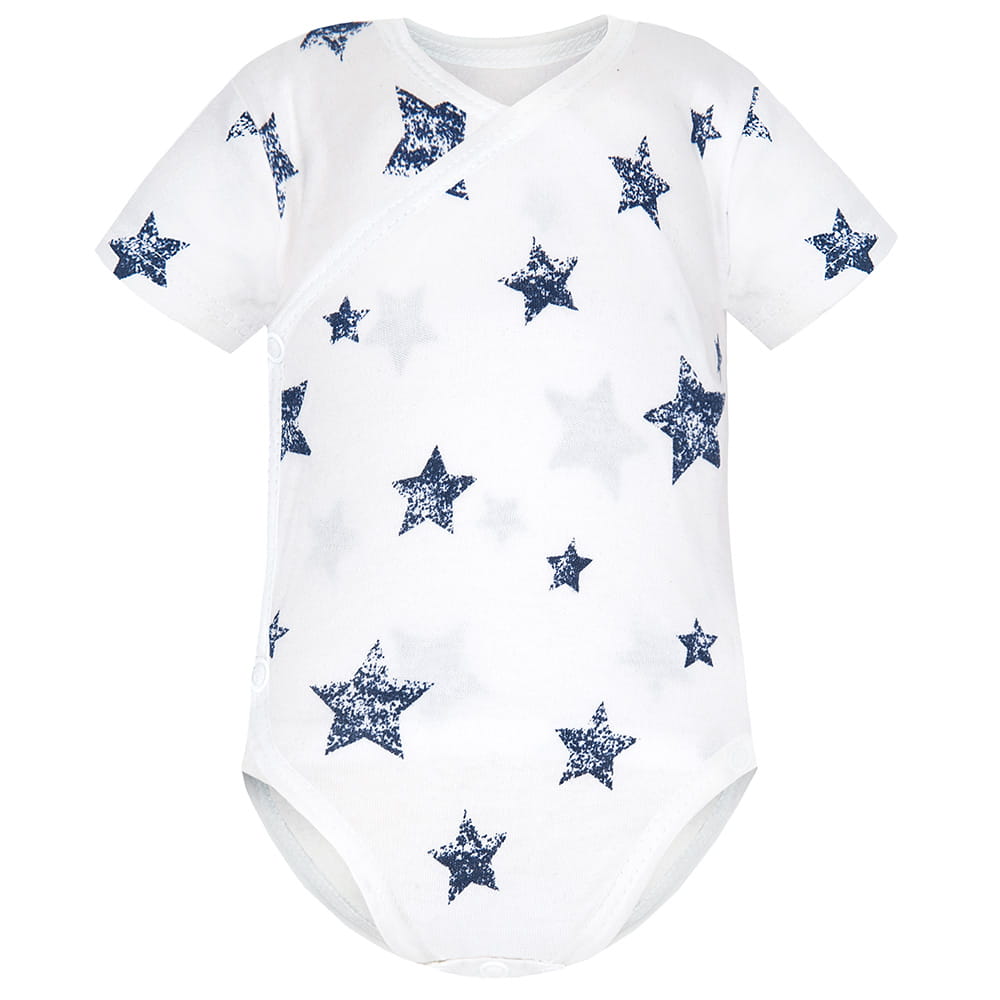 Bawełniane body kopertowe w gwiazdki idealne zarówno dla chłopca jak i dla dziewczynki. Specjalny krój bodziaka sprawi, że przebieranie niemowlaka jest komfortowe i wygodne dla młodych rodziców. Body kopertowe świetnie sprawdza się jako samodzielna część garderoby jak również połączone w zestaw z innymi ubrankami z kolekcji Granatowe Gwiazdki.