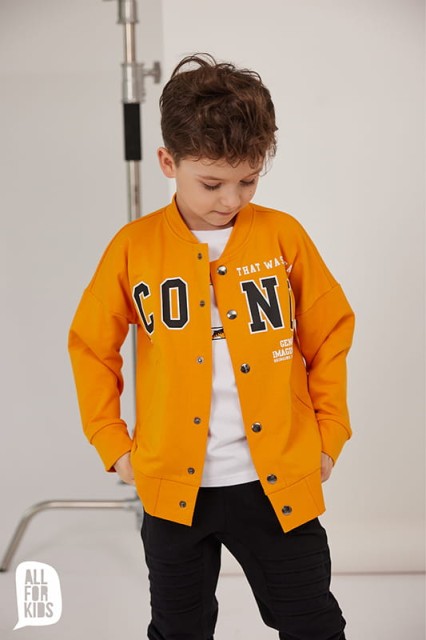 Stylowa, krótka bomberka dla chłopca, świetnie sprawdzi się jako okrycie wierzchnie na wiosnę i chłodne lato. Wykonana została z wysokiej jakości, przyjemnej w dotyku dzianiny bawełnianej w kolorze soczystej pomarańczy. Na przodzie znajduje się ozdobny duży napis "ICONIC", tył bluzy jest gładki, bez nadruku.