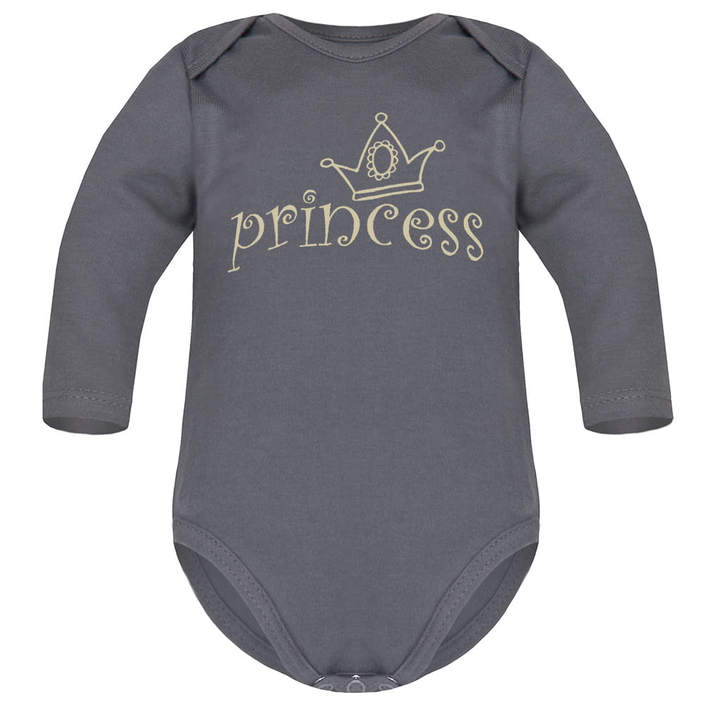 Body niemowlęce uszyte z miłej w dotyku, certyfikowanej 100% bawełny w kolorze stalowym z napisem Princess. Body rozpinane jest w kroku na bezpieczne, bezniklowe napy, taki krój ułatwia wymianę pieluszki i utrzymuje ją na miejscu. Może służyć jako samodzielne ubranko oraz tworzyć kompozycję z innymi częściami garderoby jak np. półśpiochy.