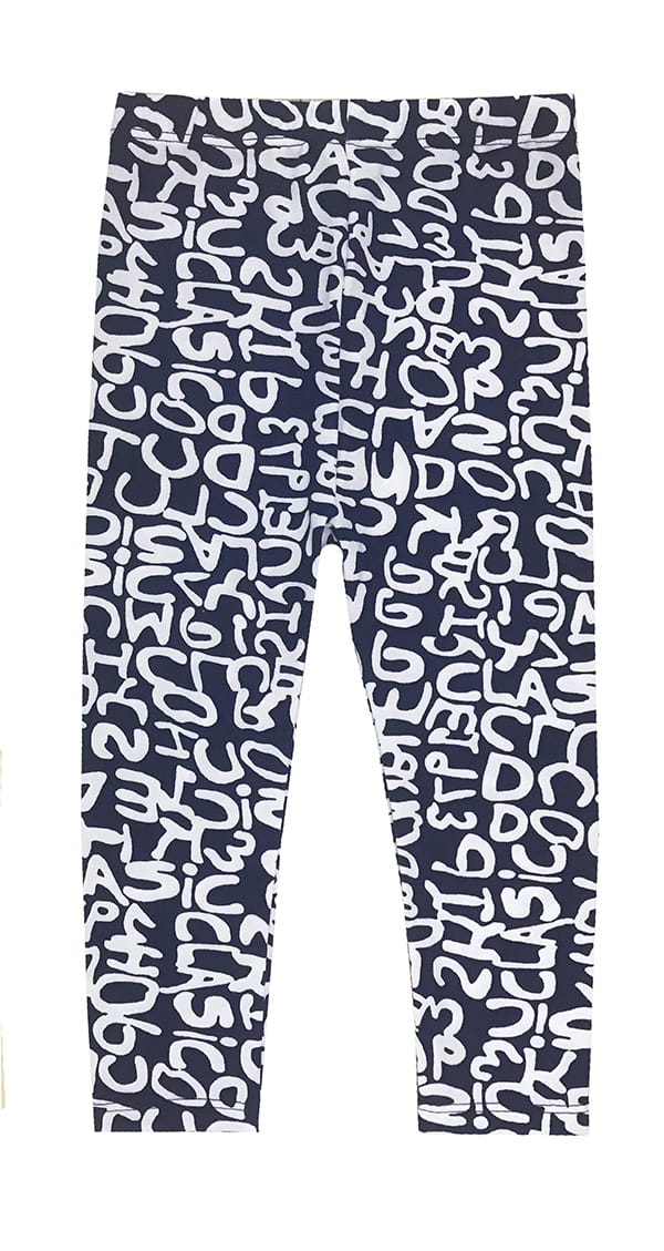 Dziewczęce legginsy niemowlęce w białe litery na granatowym tle. Wygodne spodenki dziewczęce uszyte z bawełny z niewielkim dodatkiem elastanu, dzięki czemu nie krępują ruchów dziecka, są miękkie i elastyczne. Legginsy niemowlęce występują w rozmiarach 68-104.