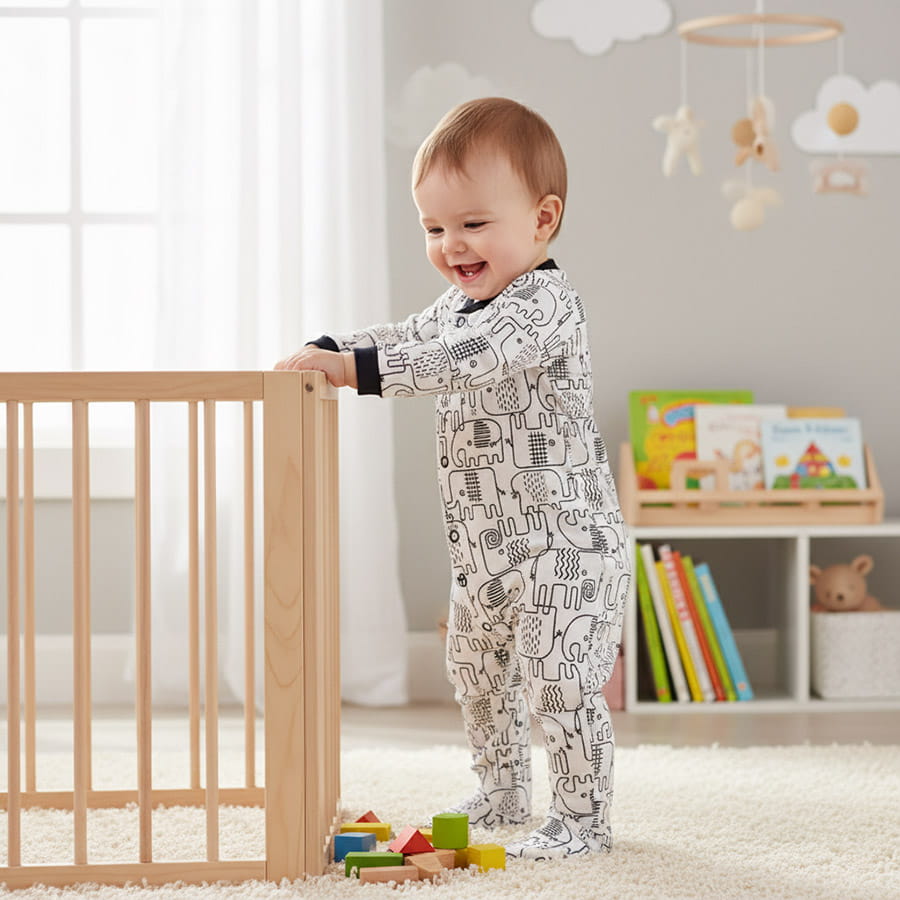 Czarno-biały pajacyk do spania, rozpinany po całej długości na bezpieczne, bezniklowe, czarne napy oraz wykończony delikatnymi, miłymi w dotyku, czarnymi ściągaczami. Pajacyk to podstawowe ubranko w garderobie każdego noworodka, sprawdzi się na co dzień, kiedy konieczna jest częsta wymiana pieluszki oraz pielęgnacja gojącego się pępuszka. Pajace w rozmiarach od 80 cm posiadają pod stopami nadrukowany system antypoślizgowy, gwarantujący bezpieczeństwo raczkującym i uczącym się chodzić dzieciom.