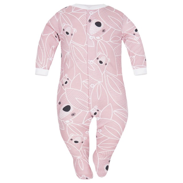 Klasyczny, komfortowy rozpinany pajacyk dla niemowlaka. Pajacyk uszyty z wysokiej jakości różowej bawełny z wizerunkiem uroczych misiów siedzących na liściach w dżungli. Przy szyjce oraz wokół rączek wykończony miłymi w dotyku ściągaczami w kolorze białym. Pajacyk posiada pełne, zabudowane stópki dzięki temu stanowi samodzielne ubranko na co dzień dla noworodka oraz jako piżamka podczas snu Maluszka.